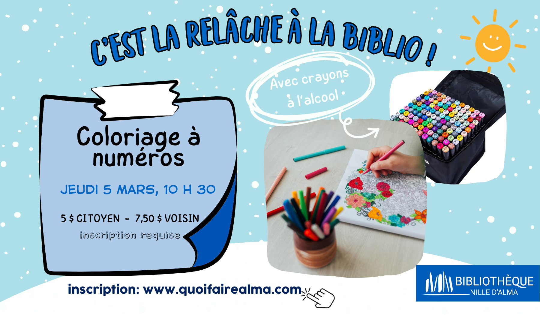 Partagez notre passion pour le coloriage mystère à numéros avec nos fabuleux crayons à l’alcool. Apprenez tous les trucs et astuces de coloriage, et surtout, profitez de ce moment zen pendant la folie de la relâche grâce à notre formule coloriage et chocolat chaud!