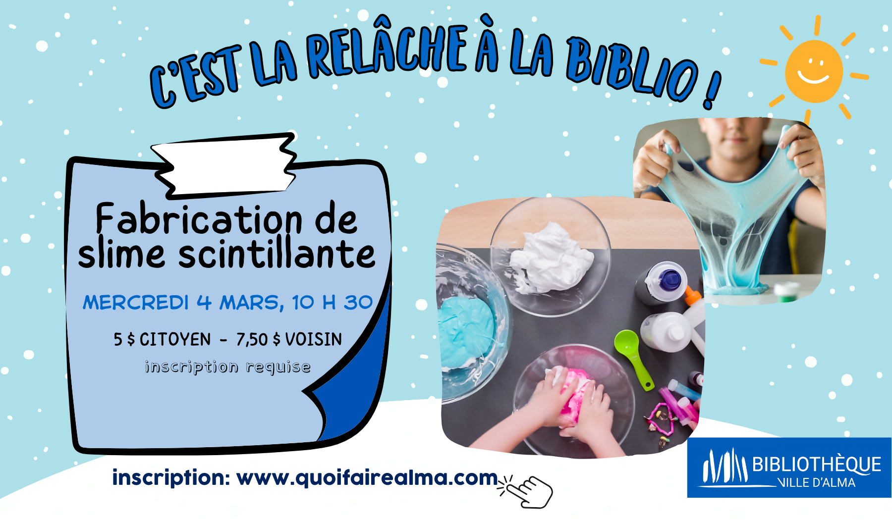 Tout le monde aime la slime! Alors venez profiter d’un atelier de fabrication et repartez avec votre slime scintillante. Des heures de plaisir à jouer avec cette pâte élastique, pour le bonheur des petits comme des grands!