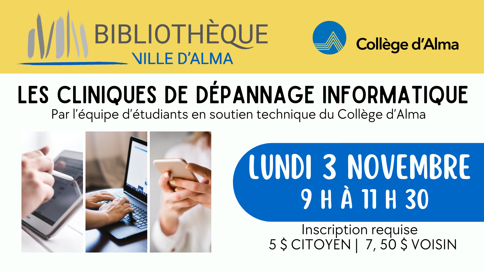C’est le retour de nos Cliniques de dépannage informatique, sous une nouvelle formule. En collaboration avec le cours de Soutien technique du Collège d’Alma, les étudiants pourront répondre à vos questions et interrogations. Vous rencontrez une problématique de mot de passe, avez besoin d’aide pour comprendre une fonctionnalité de votre tablette, vous rencontrez un petit bogue sur un logiciel? Une équipe de deux étudiants peut vous aider lors d’une rencontre privée de trente minutes. L’enseignant du collège est sur place pour les situations qui nécessitent une technique approfondie.