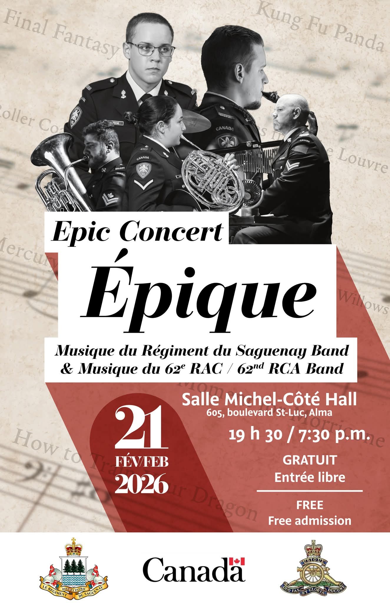 Plongez dans un univers sonore puissant et évocateur à l’occasion du Concert Épique qui unira la Musique du Régiment du Saguenay et la Musique du 62ᵉ Régiment d’artillerie de campagne. Ce concert propose un programme riche en contrastes, en émotions et en intensité, mettant en valeur des œuvres comme « Moment for Morricone » et « How to Train Your Dragon » !