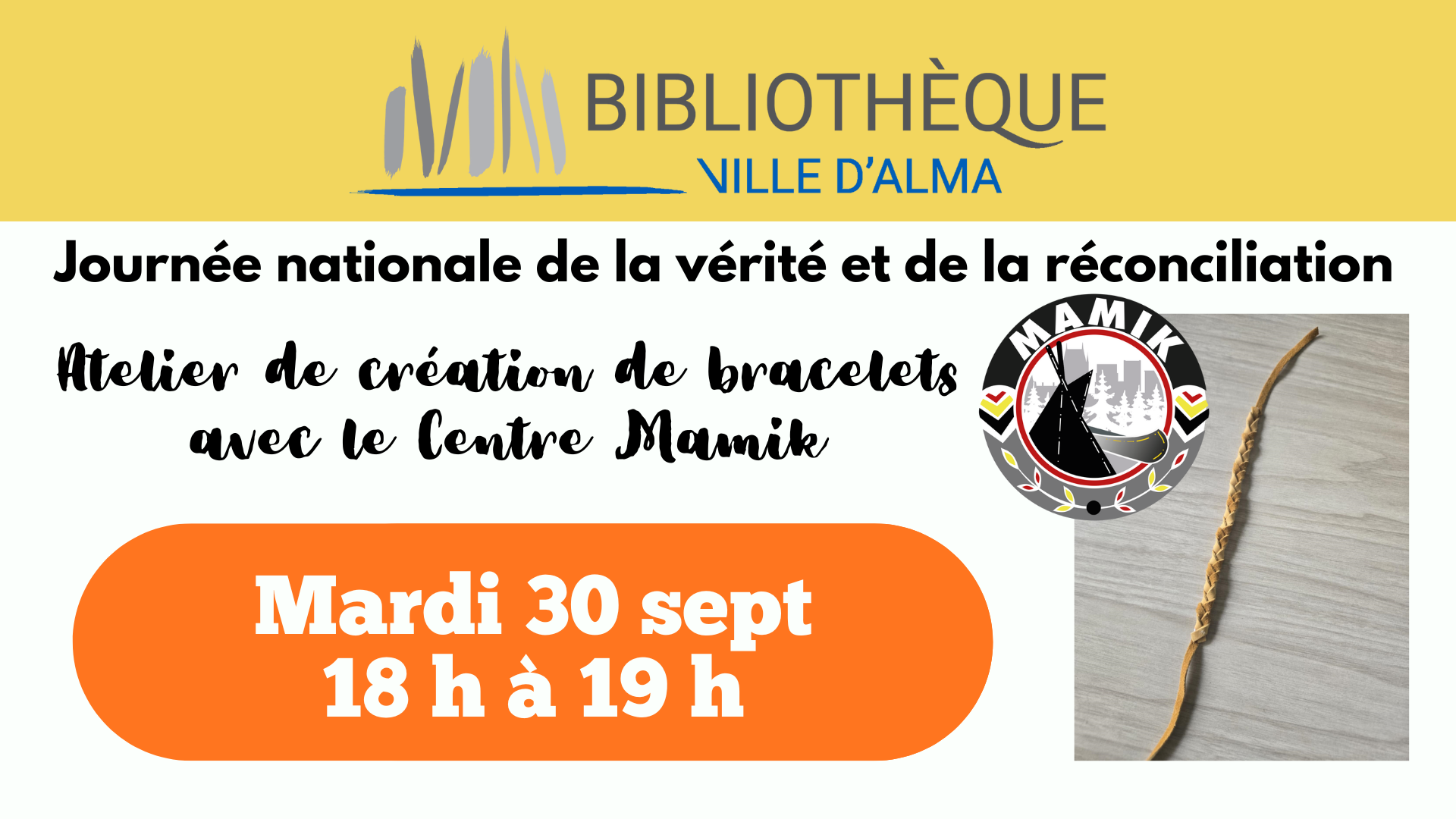 Viens rencontrer l’équipe du Centre Mamik Lac-St-Jean autour d’un atelier de création de bracelets tressés. Apprenez en plus sur la culture autochtone, discuter, posez vos questions. Une parfaite occasion de réfléchir et de s’ouvrir.