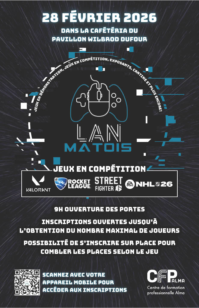Le 28 février 2026, la 5e édition du LanMatois débarque à la cafétéria du Pavillon Wilbrod Dufour à Alma pour une journée complète de gaming, d’amitié et de plaisir geek !