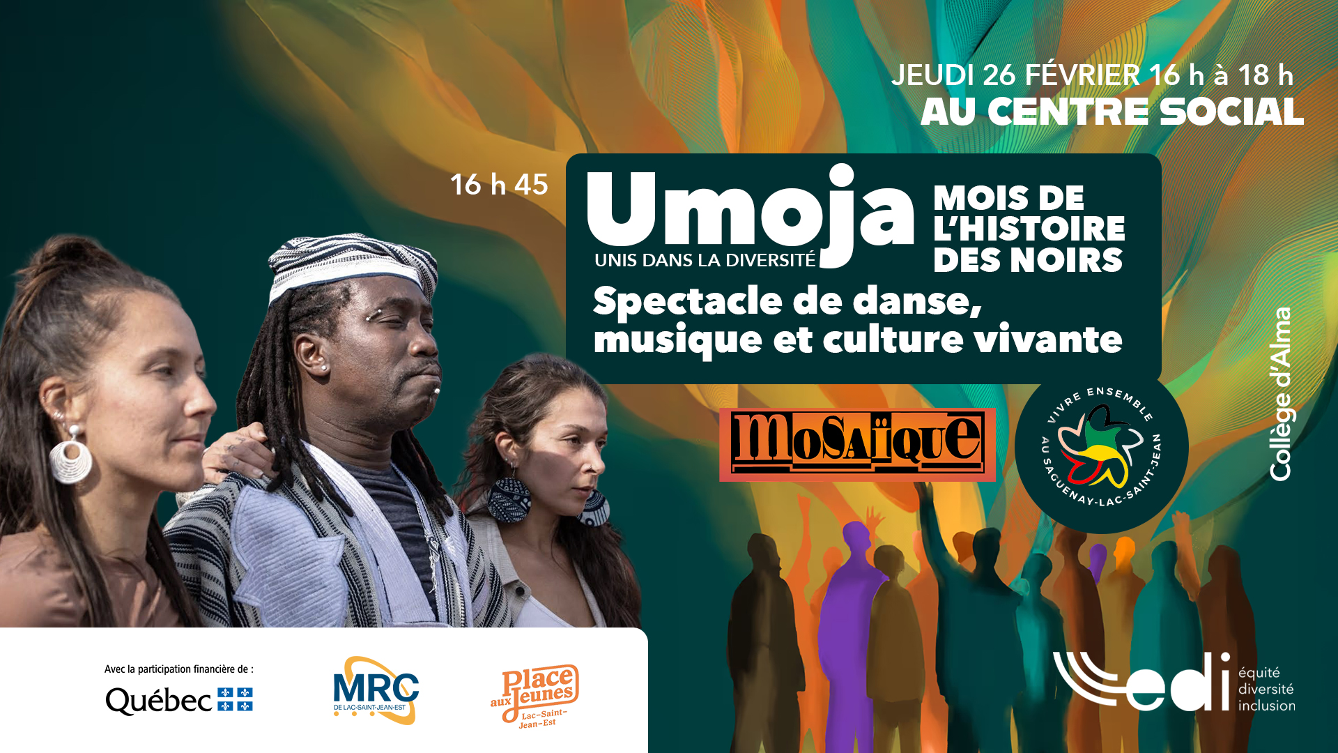 Dans le cadre des Journées collégiales de l’EDI (équité, diversité, inclusion) le Collège d’Alma présente Umoja, création artistique puissante portée par la vision de Vivre Ensemble Saguenay–Lac-Saint-Jeanui et qui signifie « unité » en langue sehalî. Ce spectacle célèbre la richesse humaine, les rencontres et la beauté de la diversité culturelle à travers la danse, la musique, et les traditions vivantes d’ici et d’ailleurs. Sur scène, trois artistes aux univers différents unissent leurs forces :