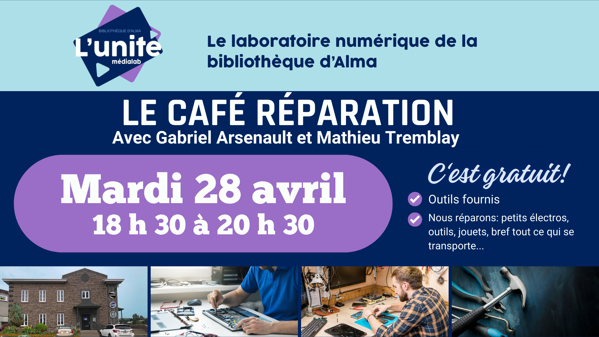 Café réparation 28 avril @ 18h30 - 20h30 L'Unité médialab 52, rue St-Joseph Sud, Alma Apportez vos objets brisés à l’Unité médialab et apprenez avec nous comment les réparer. Un moyen […]