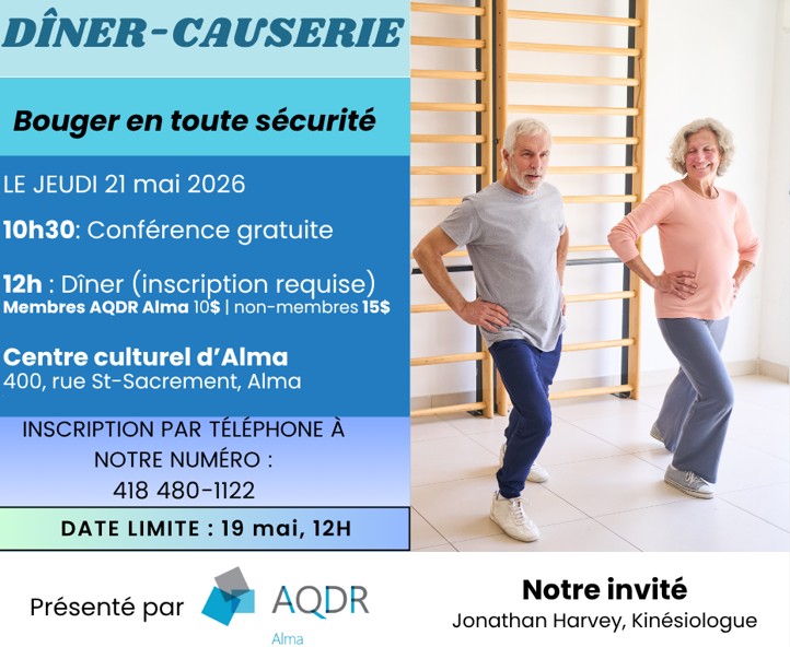 Dîner-causerie de l’AQDR Alma : Bouger en toute sécurité 21 mai @ 10h30 - 12h00 Centre culturel 400, rue Saint-Sacrement Ouest, Alma CONFÉRENCE GRATUITE // Repas facultatif à 10$/membre et à 15$/non-membre INSCRIPTIONS OBLIGATOIRES