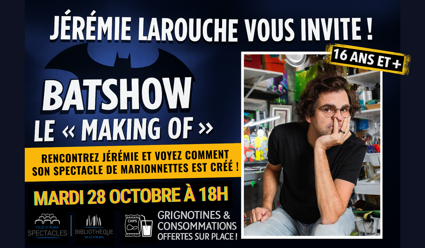 28 octobre @ 18h00 - 20h00 Batshow, le « making of » L'Unité médialab 52, rue St-Joseph Sud, Alma 🦇 ACTIVITÉ GRATUITE – AVEC JÉRÉMIE LAROUCHE! 🎭 Que vous soyez fan de Batman, d’humour ou […]