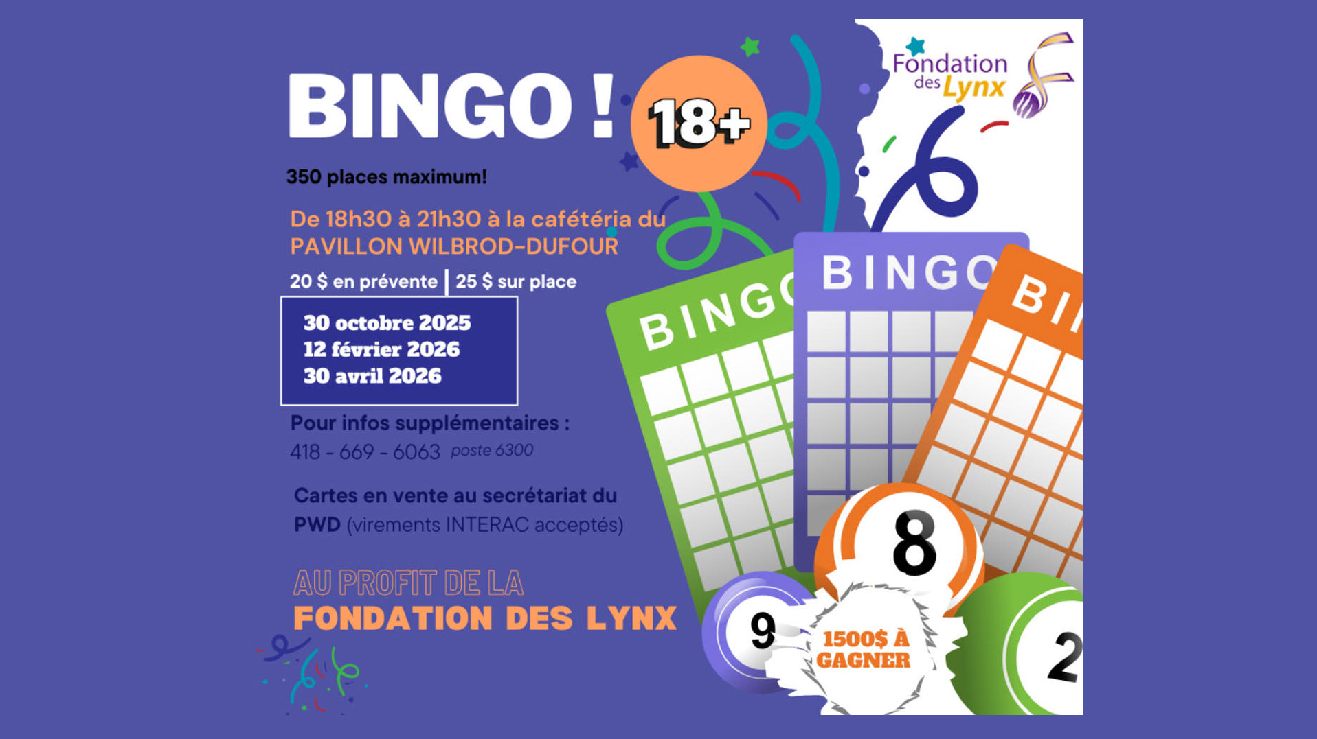 30 octobre @ 18h30 - 20h30 Bingo de la Fondation des Lynx Pavillon Wilbrod-Dufour 850, avenue Bégin, Alma Bingo de la Fondation des Lynx 30 octobre à la cafétéria du Pavillon Wilbrod-Dufour Cartes de […]