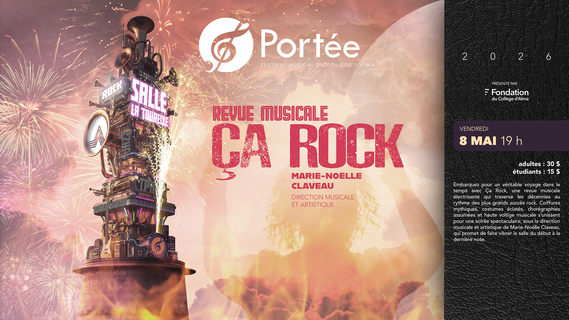 Festival Portée : Revue musicale 8 mai @ 19h00 - 21h00 Collège d'Alma 675, boulevard Auger Ouest, Alma Ça Rock! Embarquez pour un véritable voyage dans le temps avec Ça Rock, une revue musicale […]