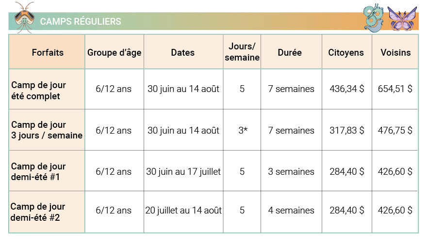 *Camp de jour 3 jours/semaine groupes disponibles pour les 6 à 10 ans : lundi, mardi, mercredi OU mardi, mercredi, jeudi. Groupe disponible pour les 11 ans et plus : mardi, mercredi jeudi.