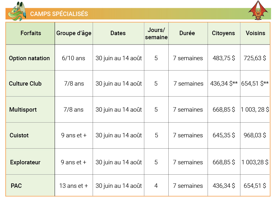 Avant le camp : 7 h 30 à 9 h INSCRIPTION OBLIGATOIRE