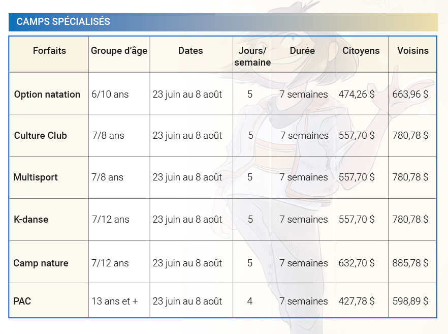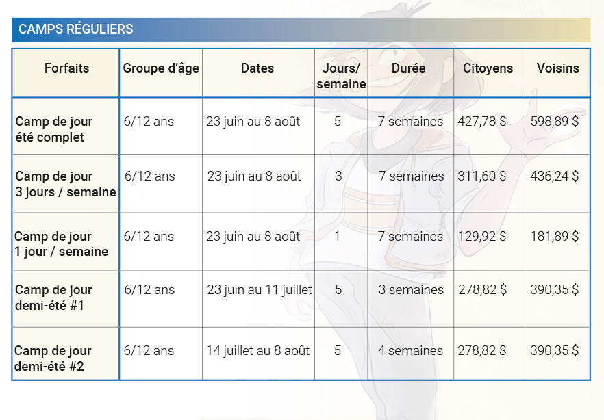 **Coût : rabais de 10 % pour le 2e enfant et de 15 % pour le 3e enfant et plus.